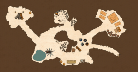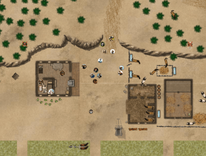Just outside the village, and off the map, are a few fenced off areas holding cattle, some shacks, and a few more building hovels. Scattered farms and ranches can be found even further outside the village, some of these have been burned to the ground.